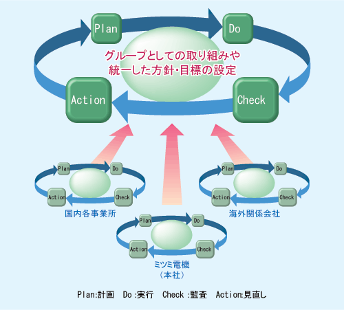 ミツミグループでは、生産活動の大半を海外で行っており、環境保護推進活動を行っていくためには、国内各事業所はもちろんのこと海外関係会社を含めた環境マネジメント体制の構築と継続的改善が不可欠です。 近年の環境問題は、地球温暖化現象、オゾン層破壊、有害化学物質の使用、廃棄物の不法投棄、生物多様性など、国境を越えた地球規模の問題にまで拡大し、我々の企業活動にも多大な影響を及ぼしています。そこで、ミツミグループは国内各事業所と海外生産拠点全てで、ISO14001のグローバル認証の取得を進めており、2010年12月19日にグローバル認証を取得しました。 ミツミグループ全体でのPDCA(Plan-Do-Check-Action)のサイクルにより、グループとしての統一的な活動方針や活動内容を周知徹底しています。さらに、国内各事業所や海外関係会社においてはISO14001のマネジメントシステムに則り、PDCAサイクルを回しながらそれぞれの活動領域に見合った環境保護推進活動を行っています。 |